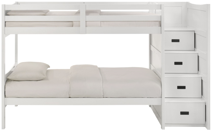 The Sami twin over twin step bunk bed combines space-saving design with practical storage for youth bedrooms. Finished in white, it features four step-integrated drawers for organized essentials. With a right-side headboard and sturdy construction, this bed offers durability and style while maximizing room layout and everyday comfort.Read More