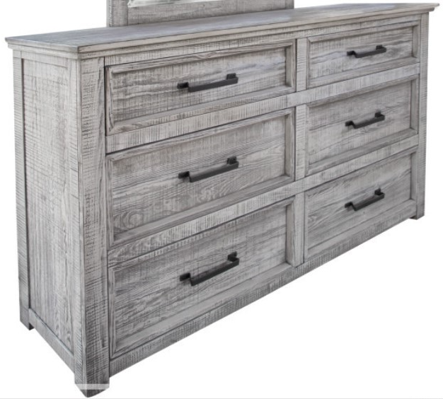 Multi-step lacquer in a glacier gray finish provides protection and depth to the wood. Wire brushed wood adds authentic rustic charm