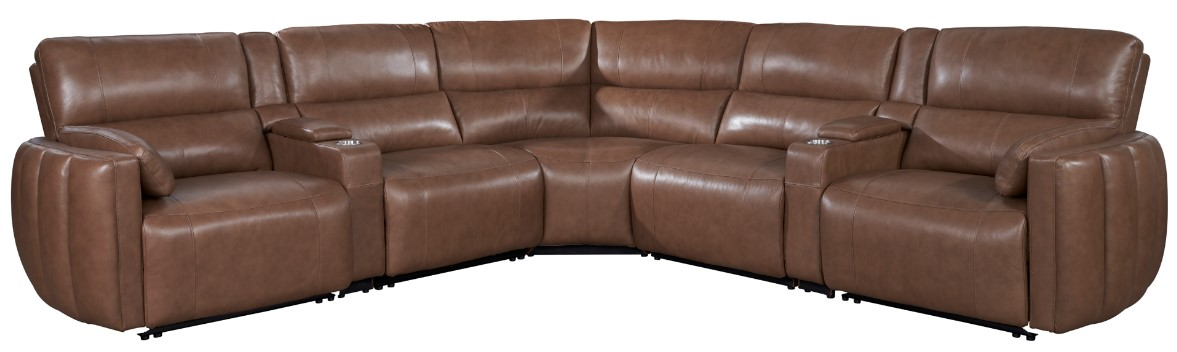 Covered in gorgeous supple Sable colored leather with custom match, this transitional sectional features convenient power headrest and recline functions. Modesto's unique slender storage consoles feature a power center and a cupholder, offering a modern spin on the traditional sectional console. Two comfort arm pillows come included, ensuring that you maintain your preferred level of comfort.Read More