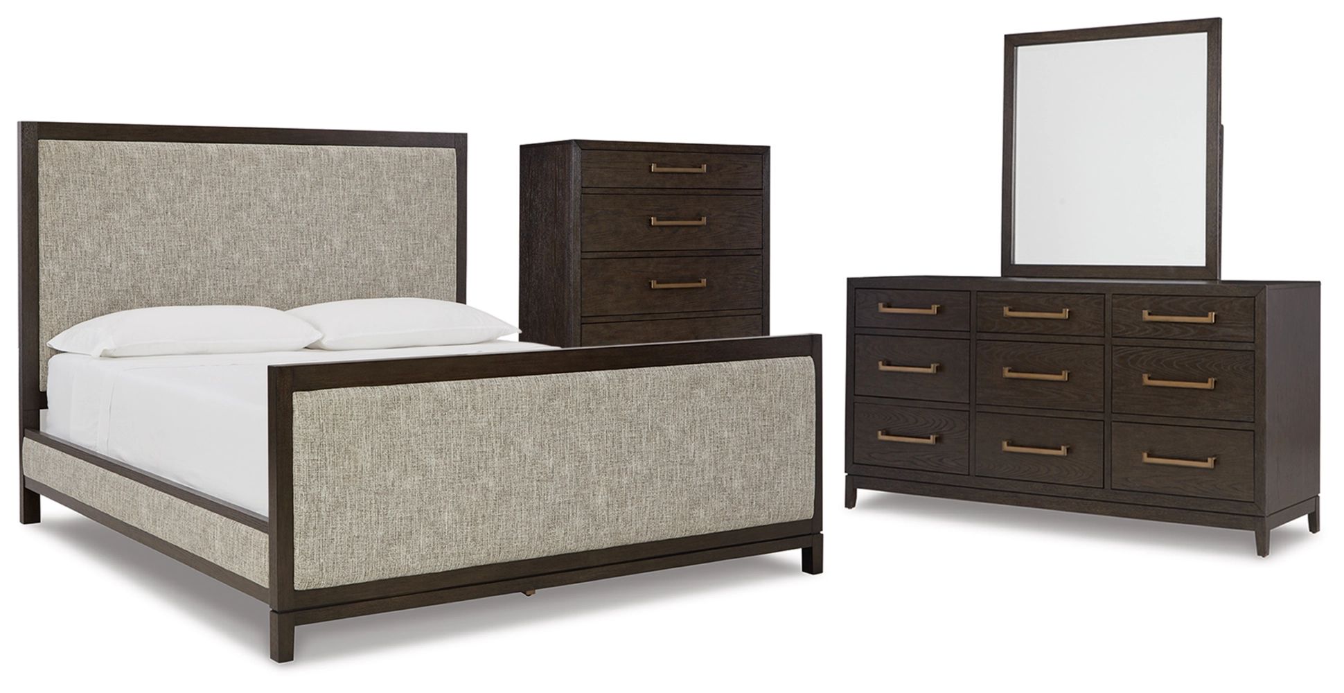 Includes king upholstered bed (headboard, footboard, and rails) 9-drawer dresser with mirror, and 5-drawer chest