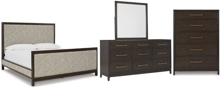 Includes queen upholstered bed, mirrored dresser and chest