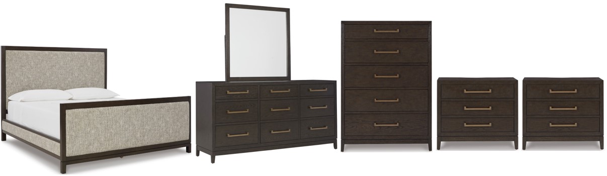 Includes queen upholstered bed, mirrored dresser, chest, and 2 nightstands