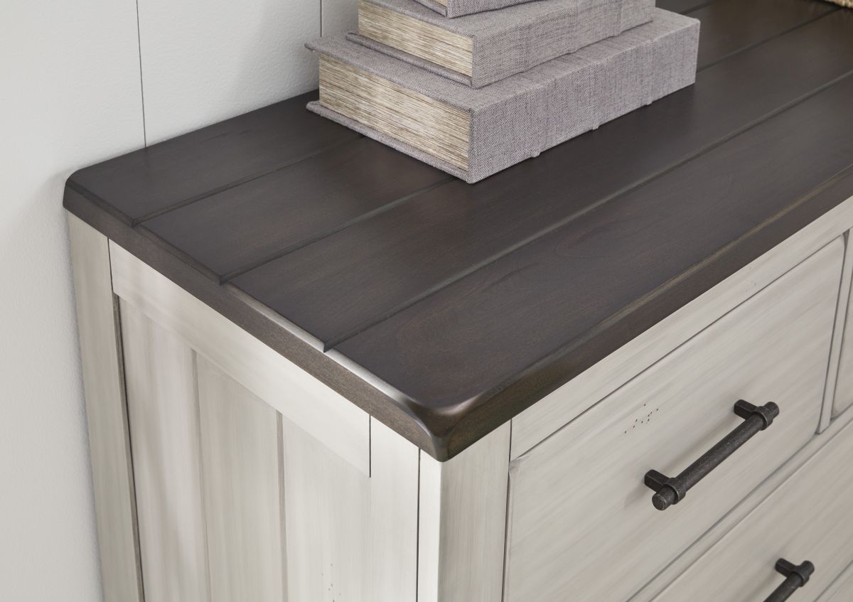 Make a farmhouse-inspired statement with this dresser. Beautifully crafted to stand the test of time, the planked effect and clean two-tone finish lend a relaxing vintage feel. Felt-bottom top drawers add a touch of luxury for the ultimate tasteful bedroom.Read More