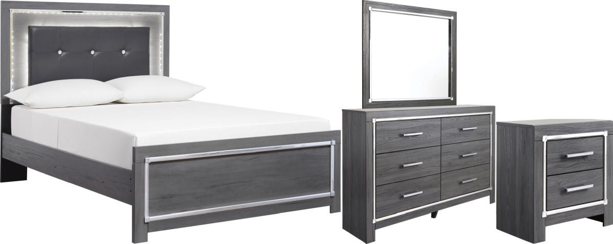 Includes a Queen upholstered panel bed (headboard, footboard and side rails included), 6-drawer dresser with mirror, and 2-drawer nightstand