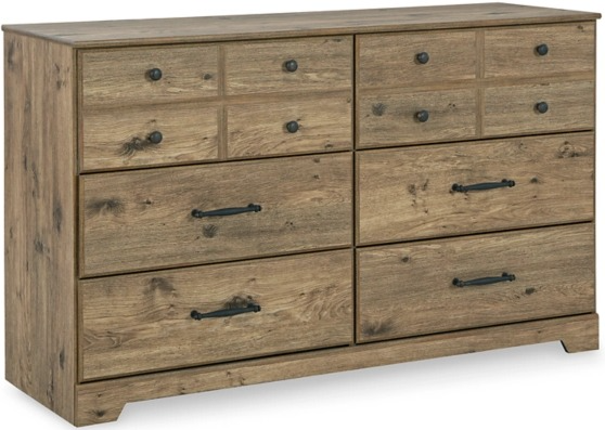 Warm rustic finish over replicated oak grain with authentic touch. Hardware is finished in a dark bronze metal finish. Side roller glides for smooth operating drawers. Drawer interiors are lined with a faux linen laminate for a clean, finished look.Read More