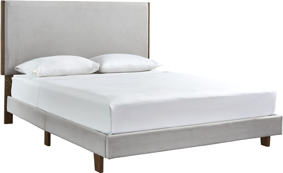A mastery in contemporary design, this queen upholstered bed is sure to awaken a love for modern low-profile styling with a softer side. Plush to the touch and so easy on the eyes, a beige fabric hugs the bed, from the linear headboard to the platform foundation.Read More